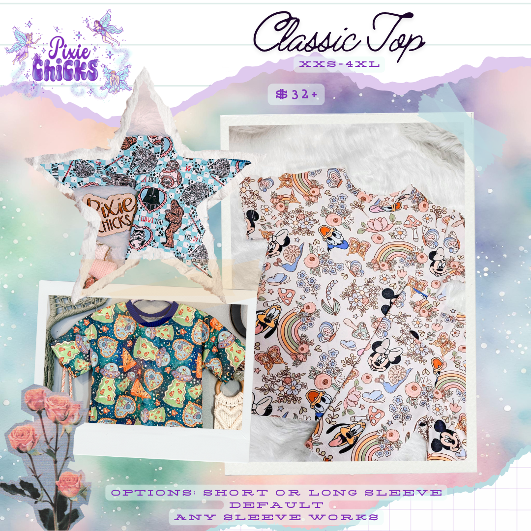 Browse my Print Collection and upload your selection with each style you order. Don't forget to add the Pixie Dust option which tells me you want me to add my touch with trim, mesh, tulle, patches, etc! For more control over what Pixie Dust gets used please select that individual addon! Without Pixie Dust OR specific add-ons the custom will be made completely in the fabric print ordered.