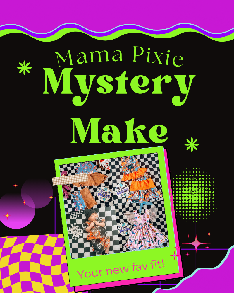 Request a mystery Pixie Chicks custom-designed and handmade piece. Whatever Mama Pixie wants to make! These makes will be extra special. You can add requests in customer notes at checkout, but I reserve the right to make a full mystery outfit! Shop here for Custom Clothing!