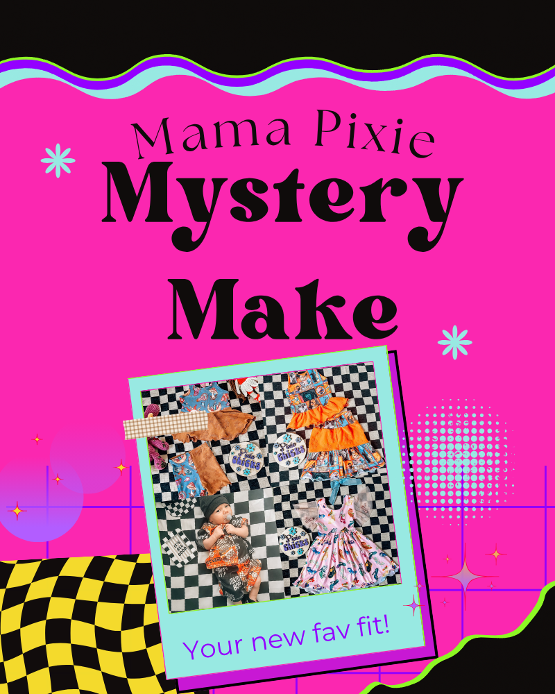 Request a mystery Pixie Chicks custom-designed and handmade piece. Whatever Mama Pixie wants to make! These makes will be extra special. You can add requests in customer notes at checkout, but I reserve the right to make a full mystery outfit! Shop here for Custom Clothing!